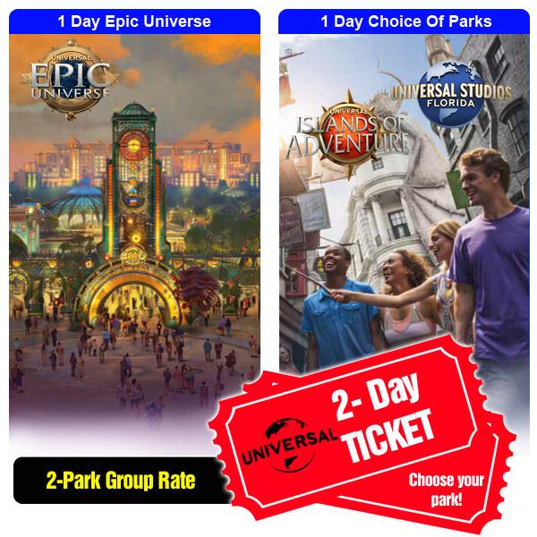 Valid for One Guest Admission for two (2) single days to Universal Studios Florida OR Islands Of Adventure on one day and One separate day at Epic Universe. Does NOT include The Hogwarts Express. Enjoy 1 day at Epic Universe and 1 day at your choice of either Universal Studios Florida OR Islands Of Adventure.